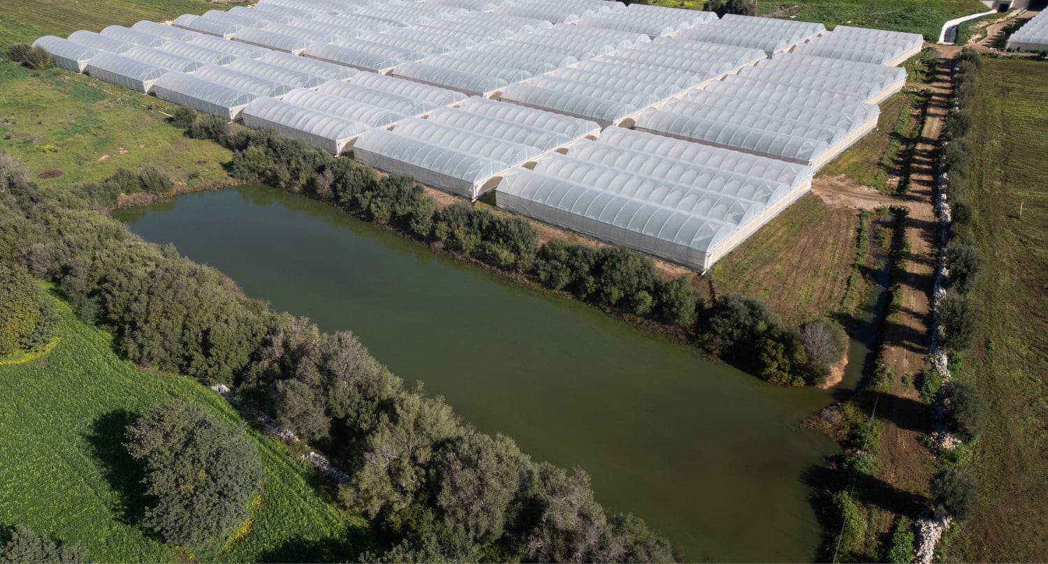 Le precipitazioni che scendono sulle nostre serre vengono convogliate – attraverso una spettacolare opera di canalizzazione integrata nella natura – in cinque bacini. Sono piccoli laghetti che ospitano fauna acquatica e avifauna migratoria, creando spazi protetti anche per i bellissimi fenicotteri. Le nostre serre sono poi circondate dai fiori: aiuole e piante nelle bordure per migliorare l’impatto – anche estetico – dei luoghi dove coltiviamo i nostri ortaggi.